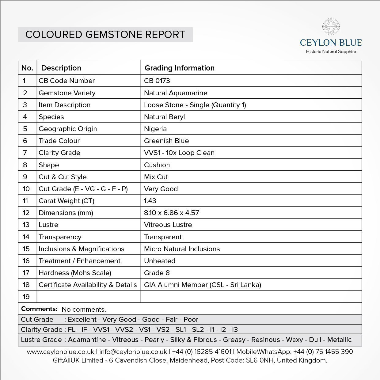 Aquamarine 1.43ct Greenish Blue Cushion Shape – CB 0173