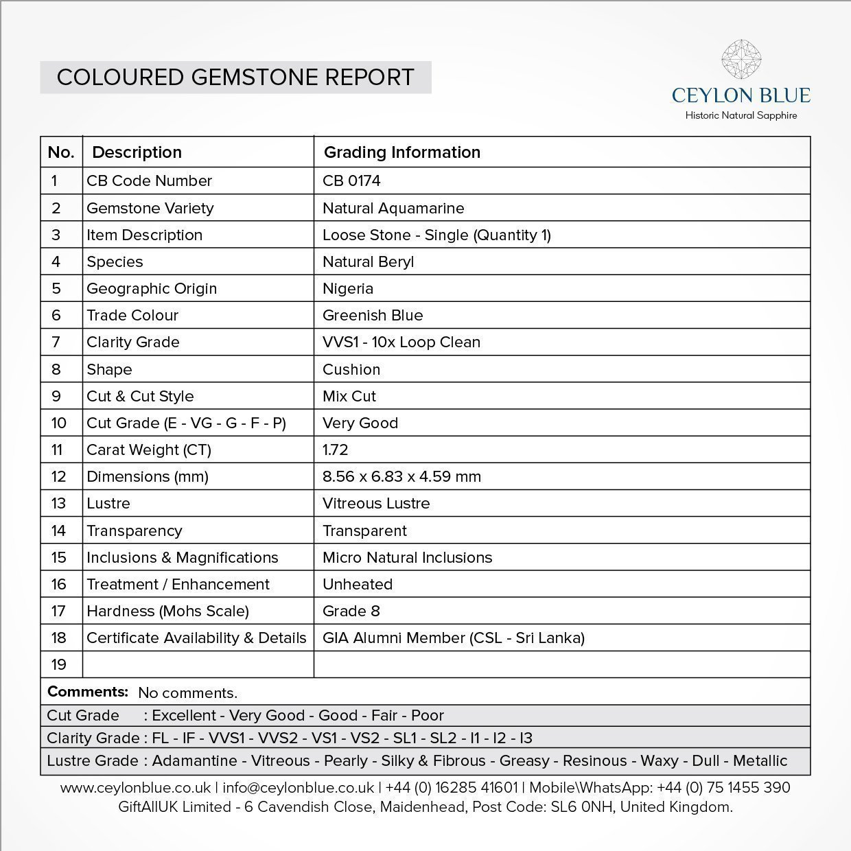 Aquamarine 1.73ct Greenish Blue Cushion Shape – CB 0174