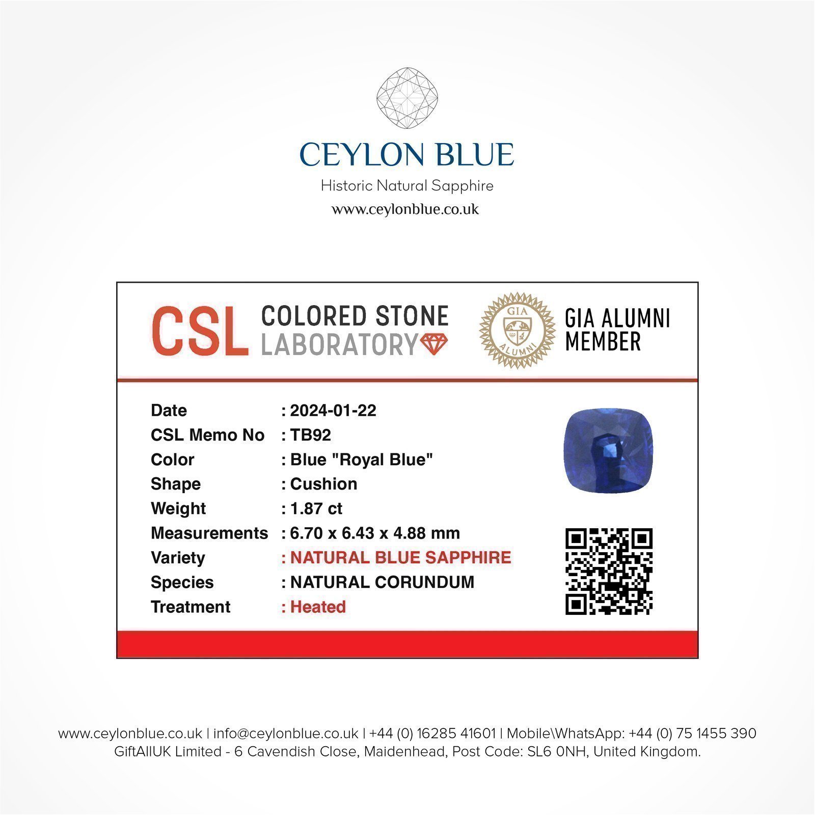 Blue Sapphire 1.87ct Cushion Shape 6.70×6.43×4.88mm – CB0210