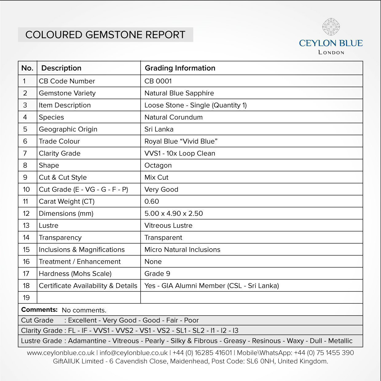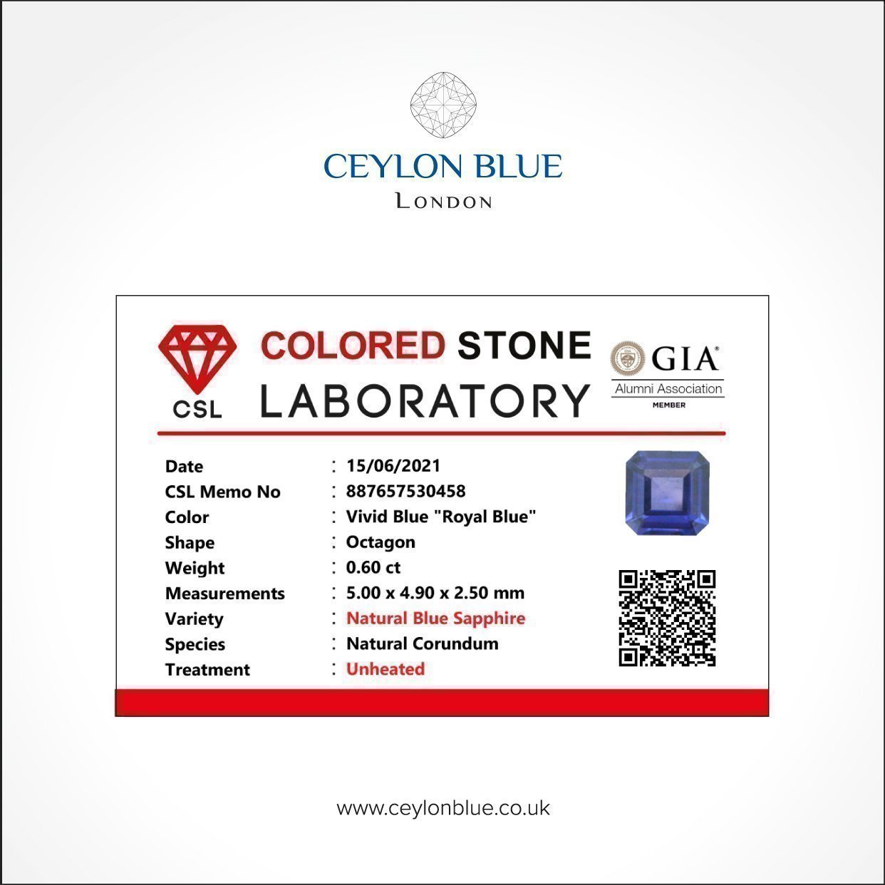 Ceylon Blue Sapphire – Royal Blue 0.60ct Octagon Shape – CB 0001