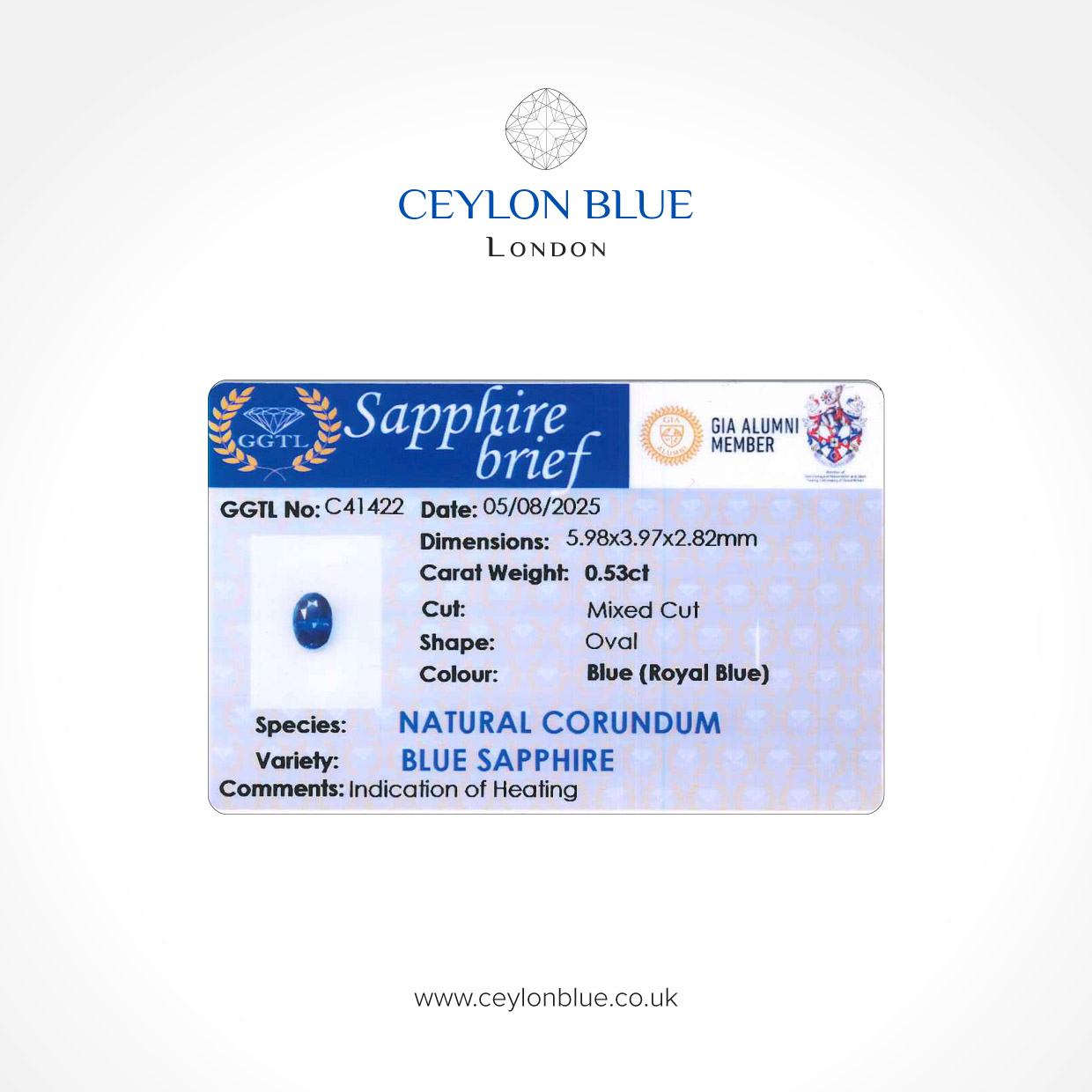 This heated Ceylon Blue Sapphire is skilfully cut in an oval calibrated shape, weighing between 0.50 to 0.65 carats—perfect for precision jewelry settings. The gentle heat treatment, a traditional enhancement method, reveals the stone’s full brilliance while maintaining its natural integrity.