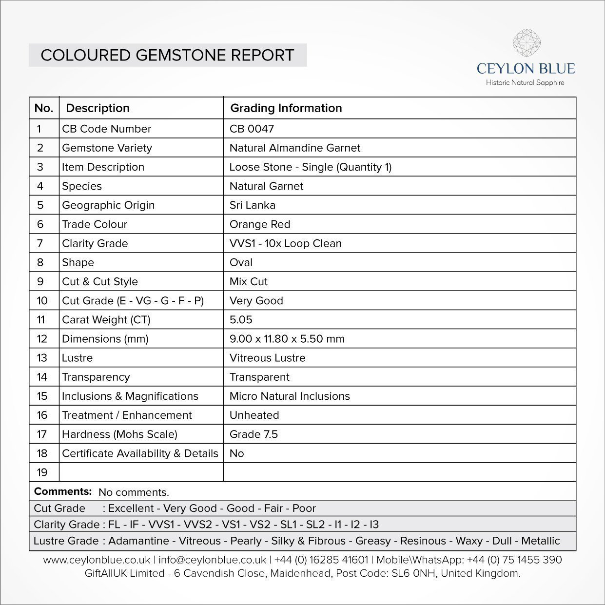 Orange Red Almandine Garnet 5.05ct Oval Shape – CB 0047