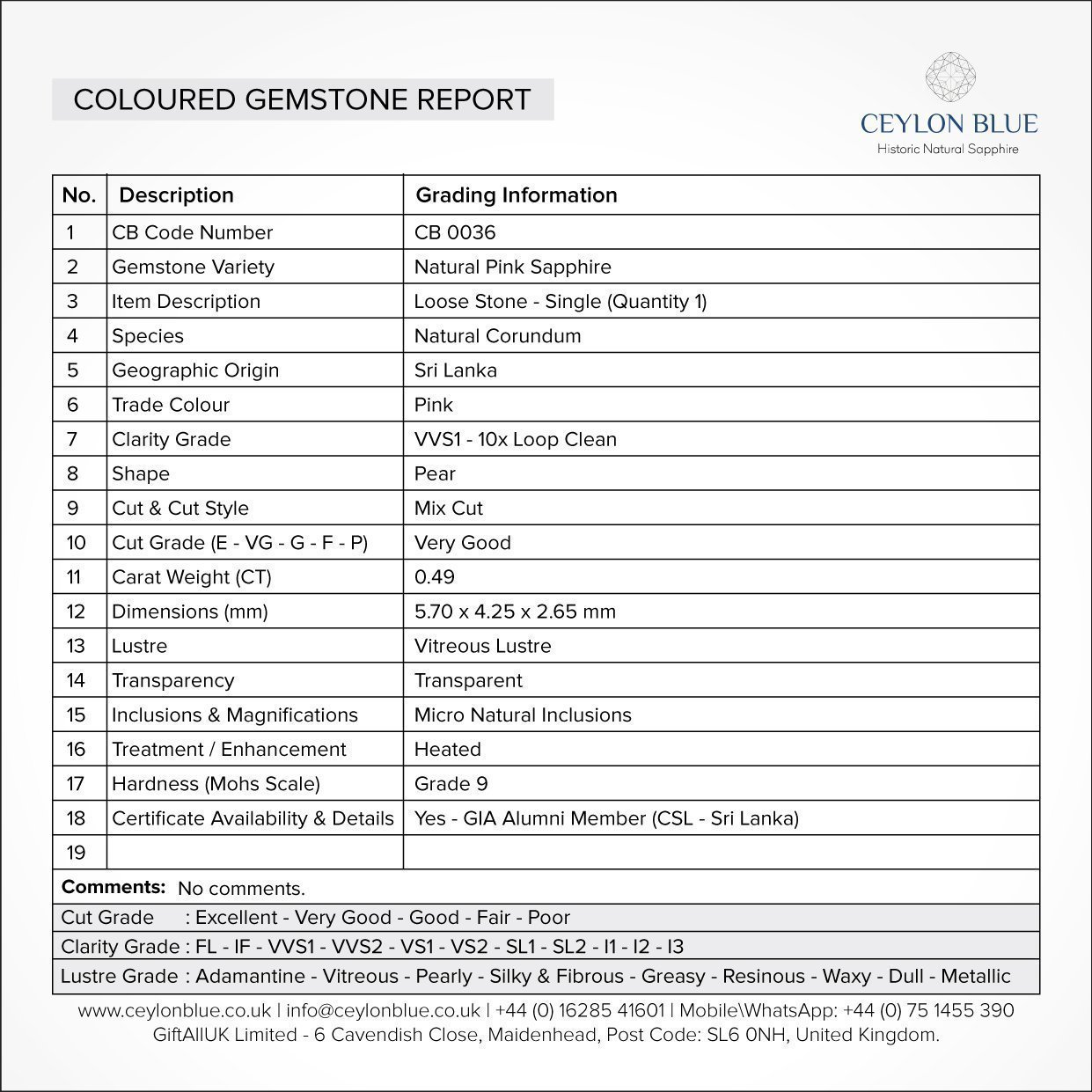 Pink Sapphire 0.48ct Pear Shape – CB 0036