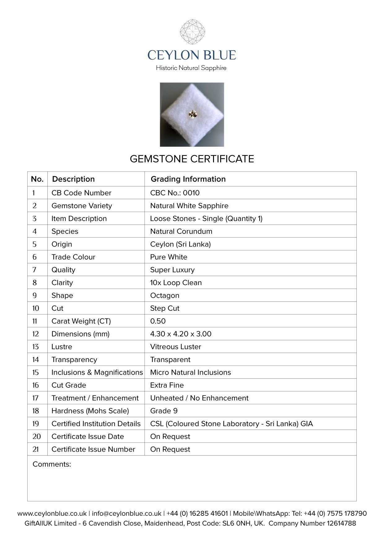 Pure White Sapphire Octagon 0.50ct – CB 0010