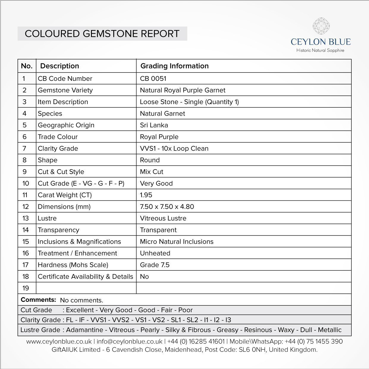 Be the first to review “Royal Purple Garnet 1.95ct Round Shape – CB 0051”